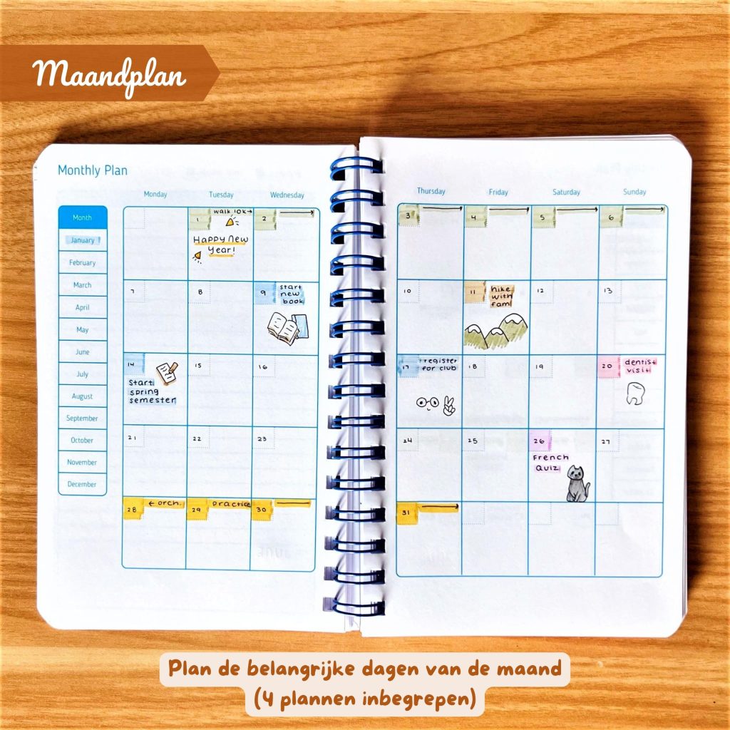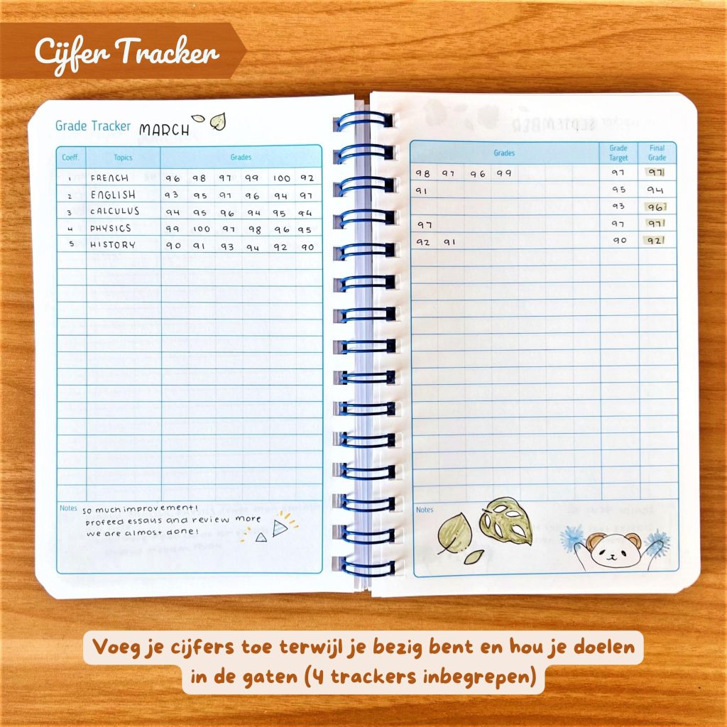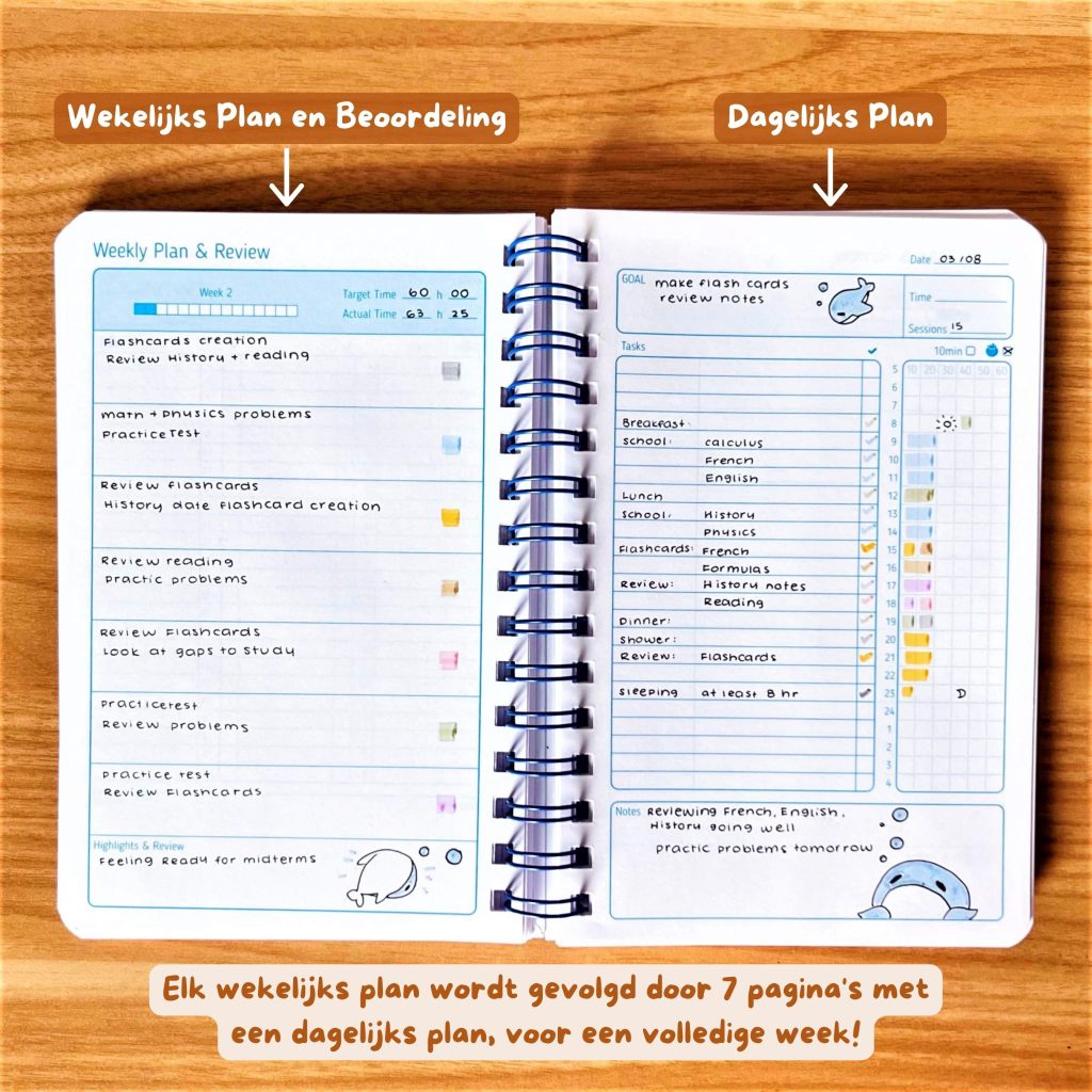 De Studieplanner is inclusief 15 weken van dagelijkse planpagina’s voor 3 volledige maanden studie en zit boordevol goed ontworpen functies!