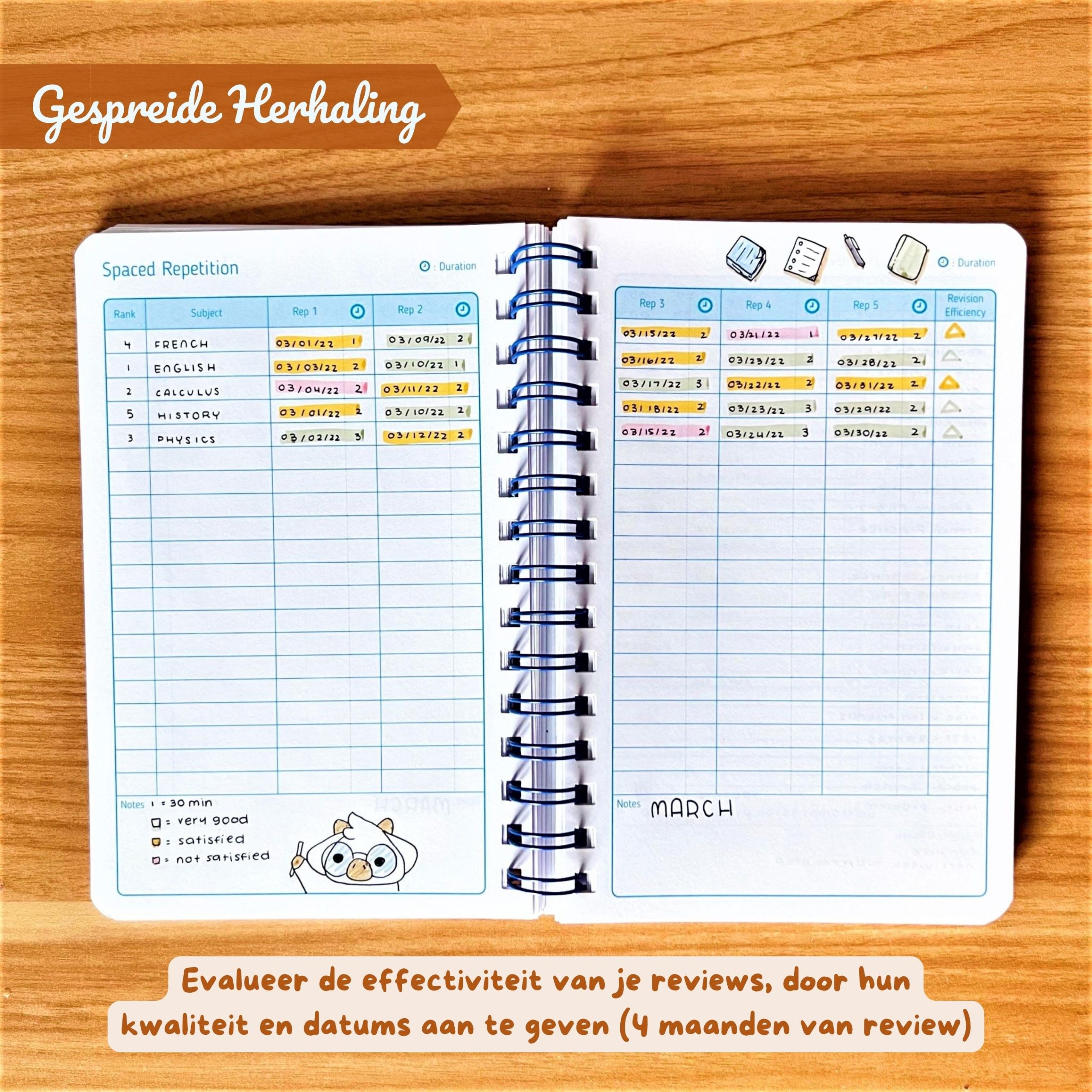 Gebruik de methode van gespreide herhaling voor efficiënter leren. Stel uw eigen regels op om de effectiviteit van uw herzieningen te beoordelen, en een datum voor elke “Herhaling” (Rep) of elke relevante informatie om u te helpen vooruitgang te boeken.
